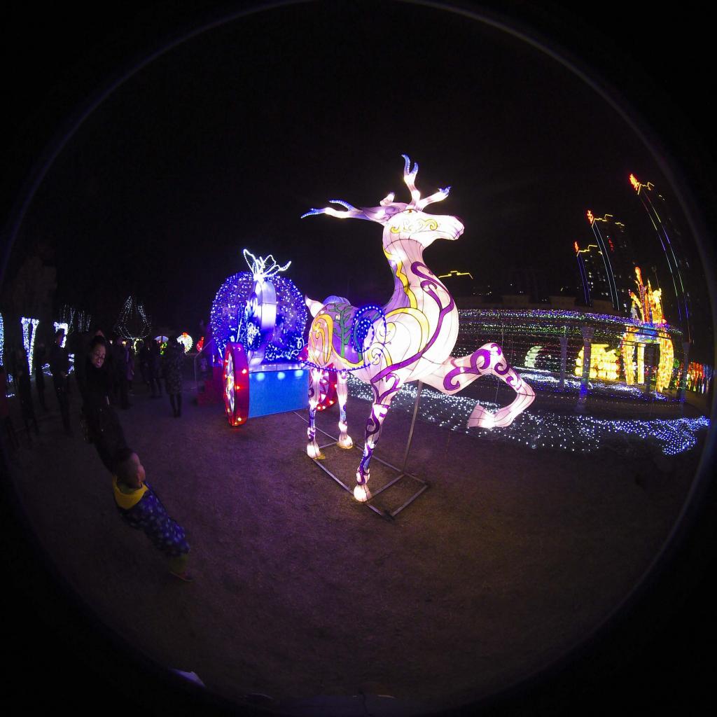 第1天 最喜欢的一张照片,透过彩灯看南瓜车,麋鹿的造型非常灵动。将彩灯作为前景,Camorama4K全景摄像机将彩灯拍摄成了一个圆形,穿过圆形看南瓜车,形成一个画中画构图。