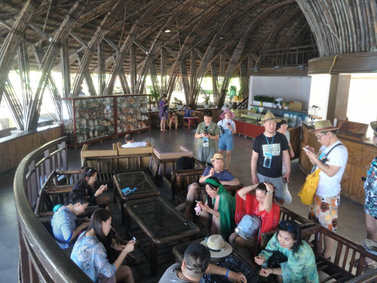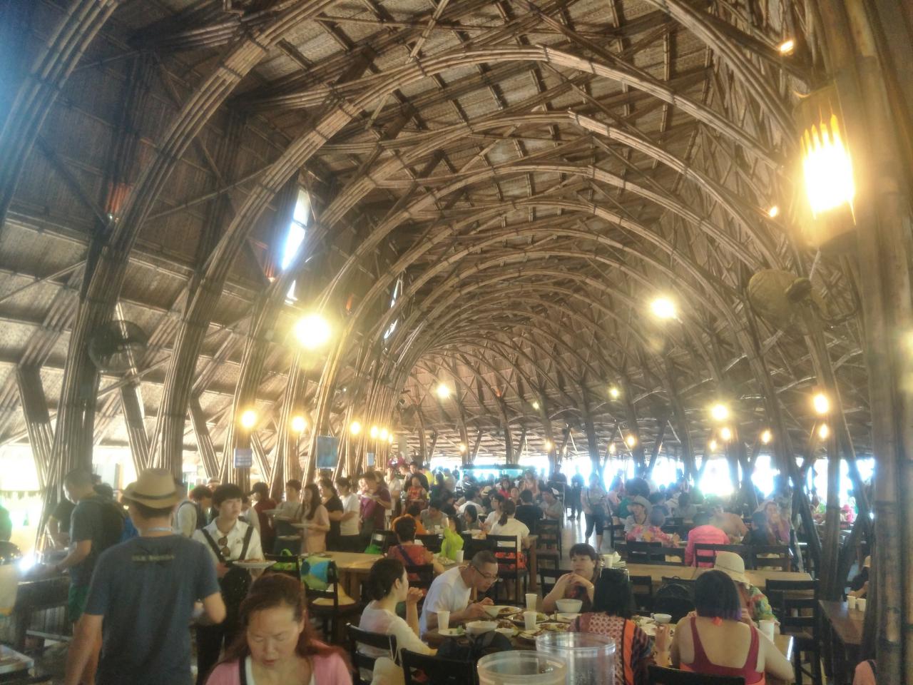 第1天 这就是刚才我上岛时,看到的建筑物。它的内部基本上都是以竹子和木材构建而成,因为这里每年的雨水很多,所以它采用了圆弧型的屋顶设计,同时这些竹子和木材也经过防潮的处理,坐在竹板制成的椅子上,凉凉地十分舒服。