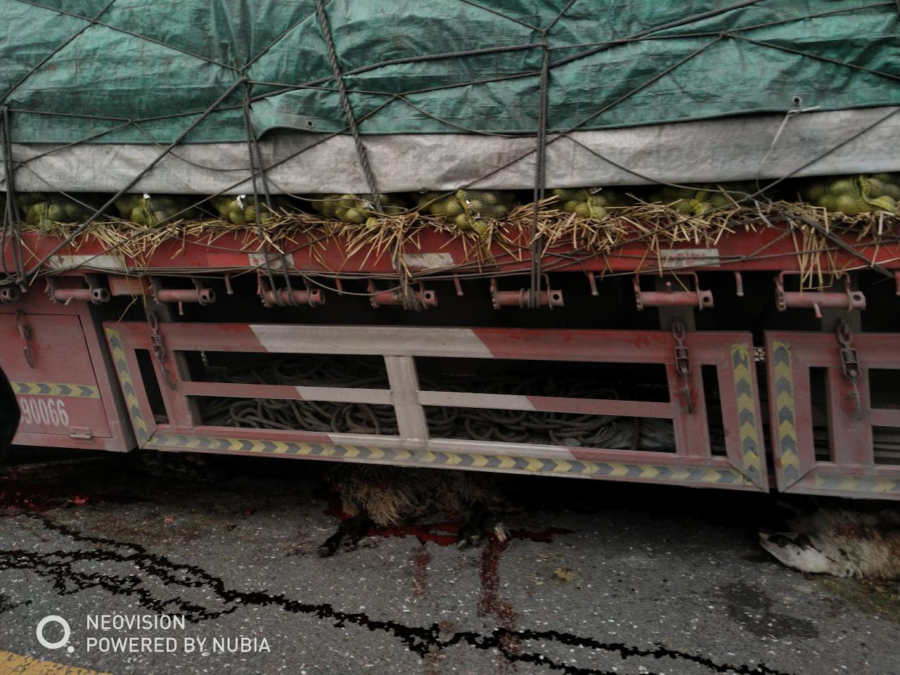 第1天 草原行车一定要注意控制车速,这台大货车因为刹车不及时,十几头羊惨死在车轮下。