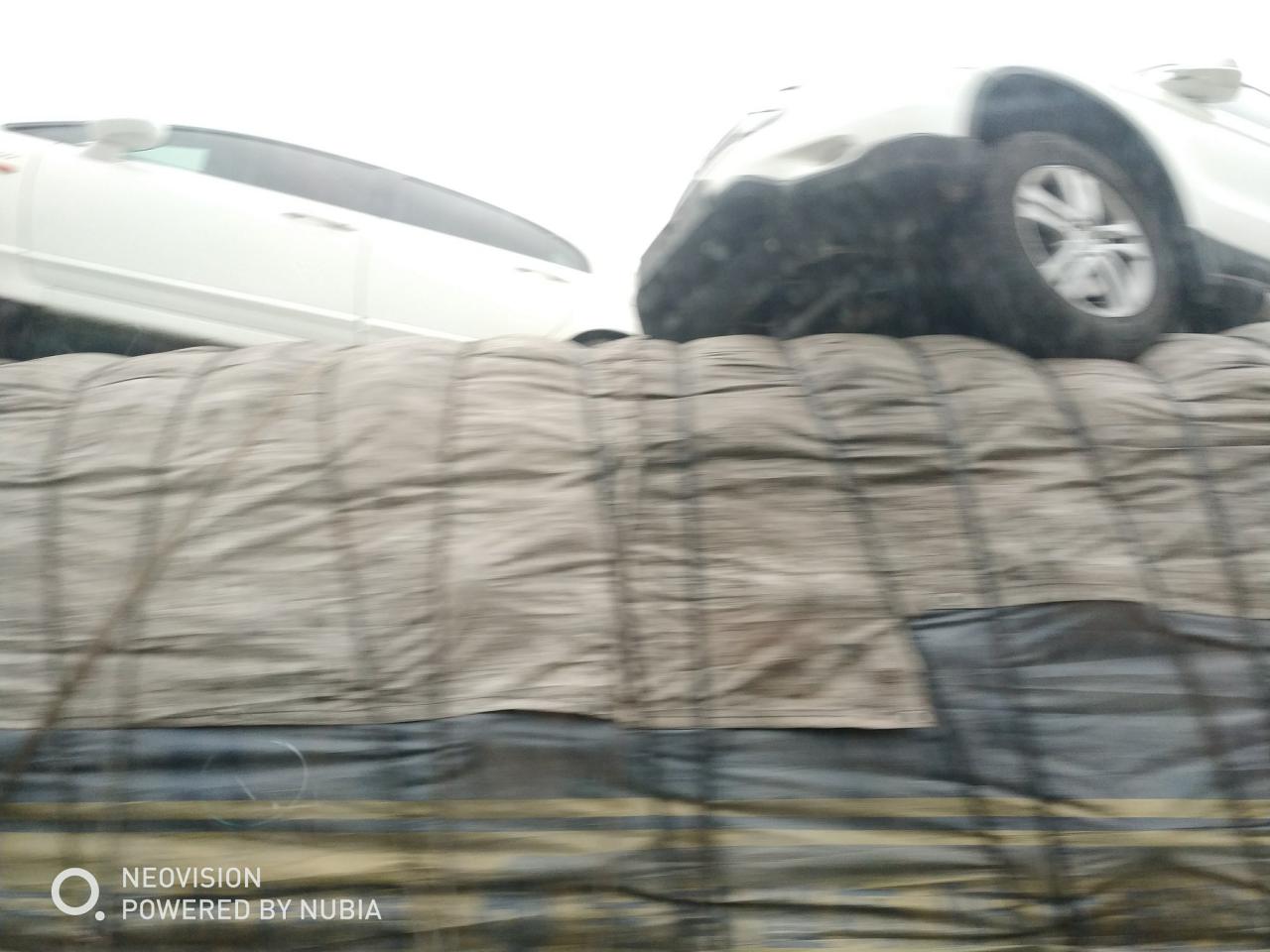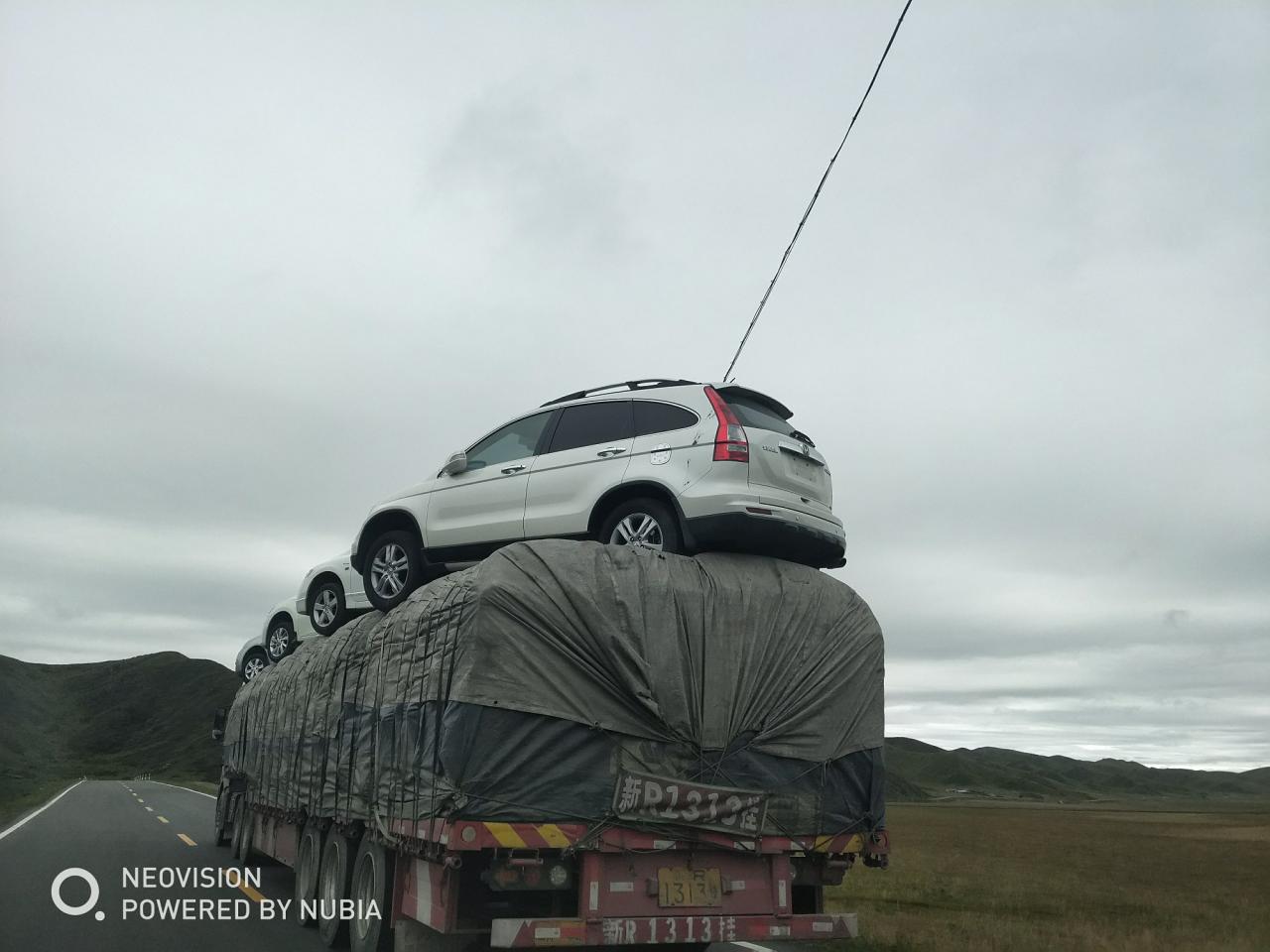 第1天 这辆车就有点意思了,在车顶上还拖着四辆车,即使不超载也肯定超高了,关键是固定的并不牢固。